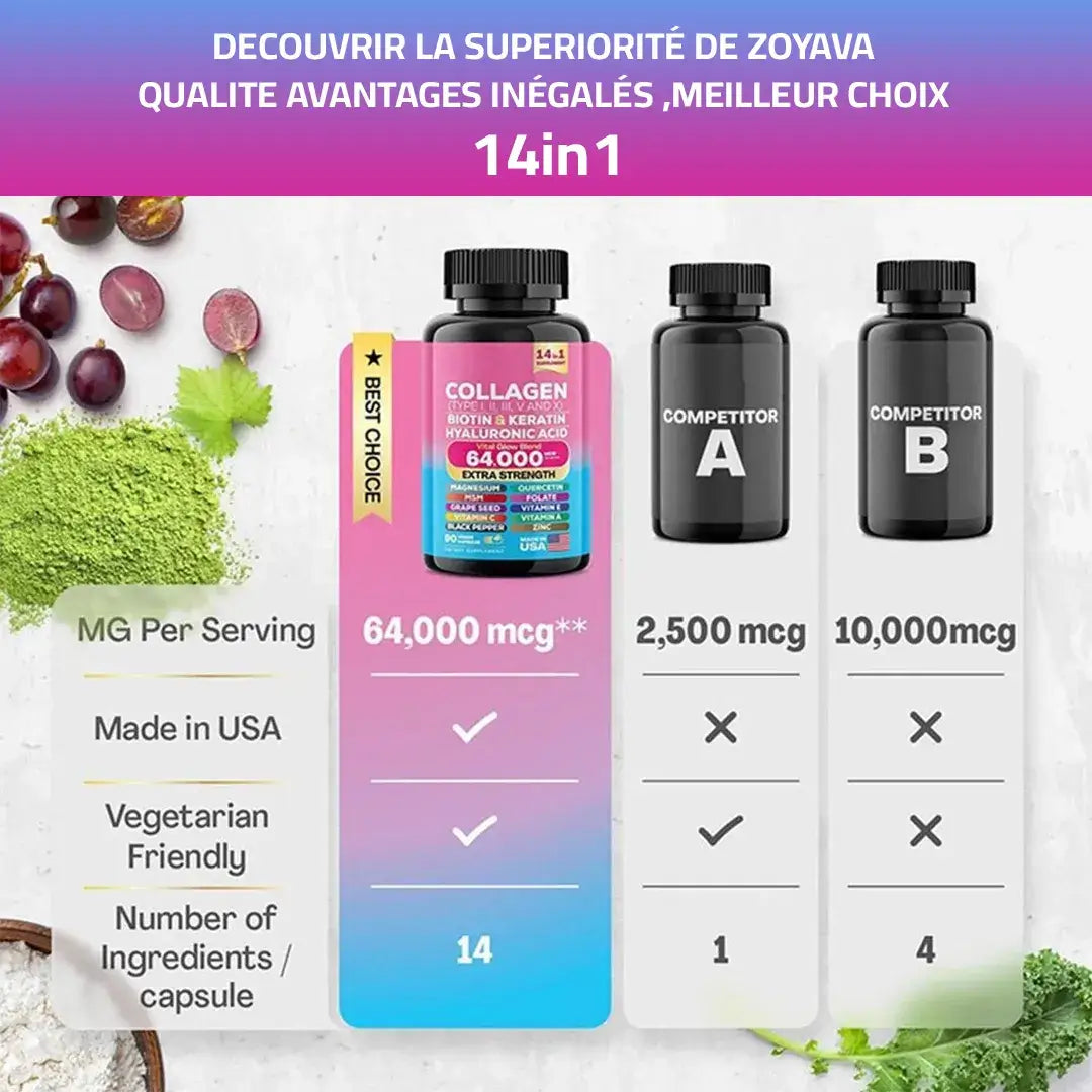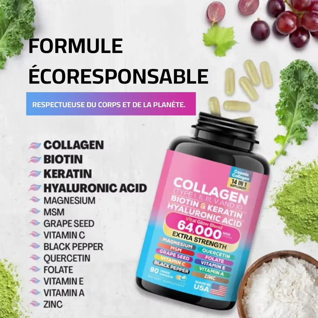 Chaque capsule contient un mélange harmonieux de 14 types de collagènes, enrichi en acide hyaluronique, pour une absorption optimale et des effets visibles. Cette diversité permet de cibler plusieurs zones du corps à la fois : peau, articulations, ongles, cheveux.